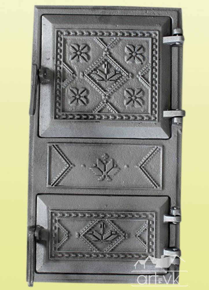 Дверка спарена чавунна "Вишиванка" 265х480 - спаренное виконання пічних дверцят дуже зручно у використанні, по-перше, легше в установці, по-друге дверцята закріплені на одній платформі, що сприяє більш довгому рядок експлуатації і по-третє вам не потрібно купувати окремо топкові дверцята і дверцята для піддувала.